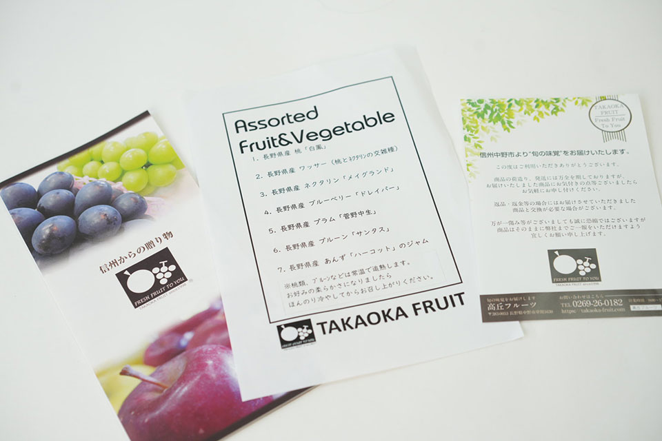 ちなみに、弊社の「長野県カタログギフト~しなののかたち~」には「ぶどうコース」「かりんコース」といったコースがあり、その中に高丘フルーツさんの「信州フルーツ詰合せ」が掲載されています。贈り主さまから贈られたカタログから、受け取った方が自分で好きな商品を選べる仕組みなので、「本当に欲しいものを選んでもらえる贈りもの」として人気です。
