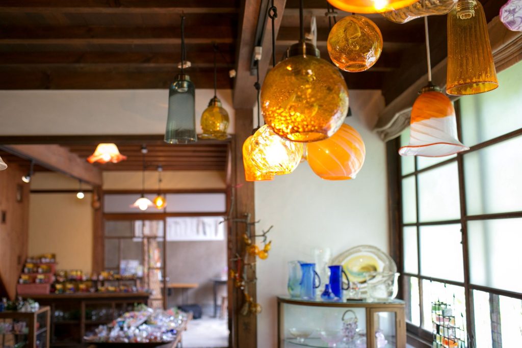 吹きガラスならではの光のゆらぎがあたたかく、夜の店内を優しく包みます。