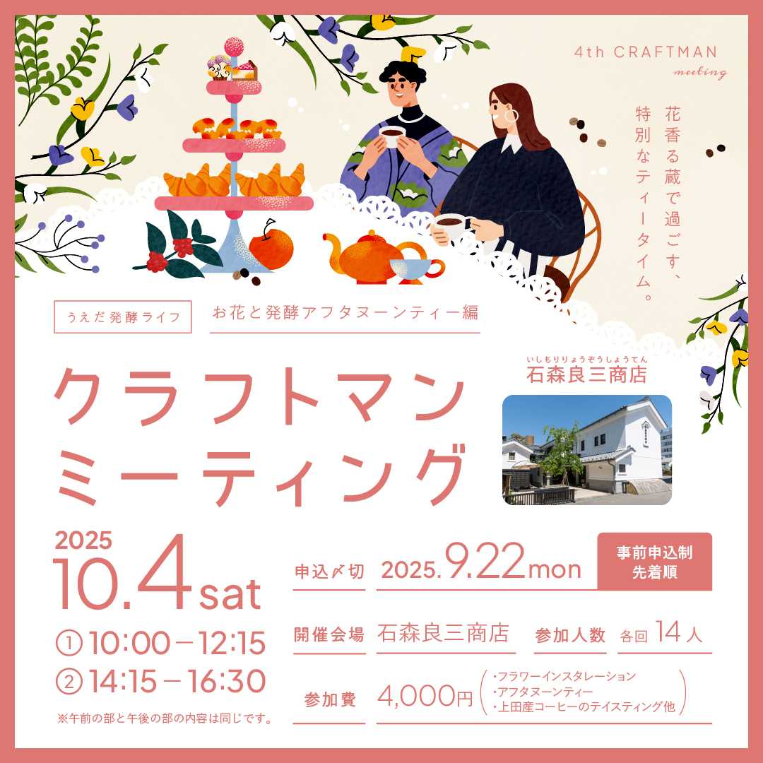 4回目をむかえる上田市主催のクラフトマンミーティング。 今回は当店を舞台に開催されます。 テーマは、花香る蔵で過ごす特別なティータイム。